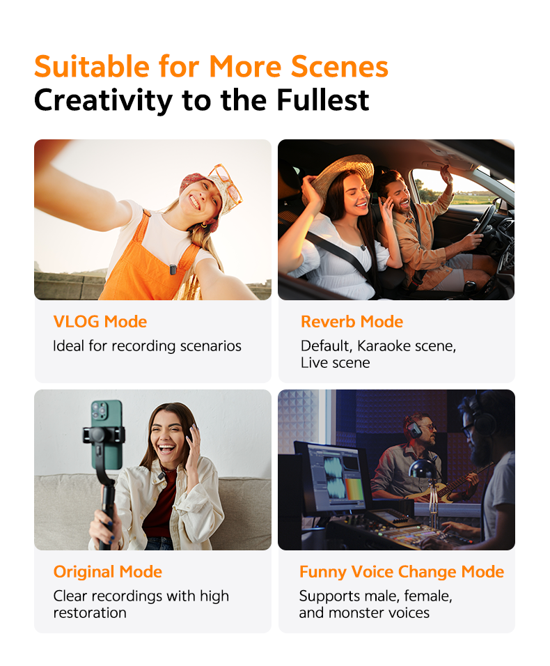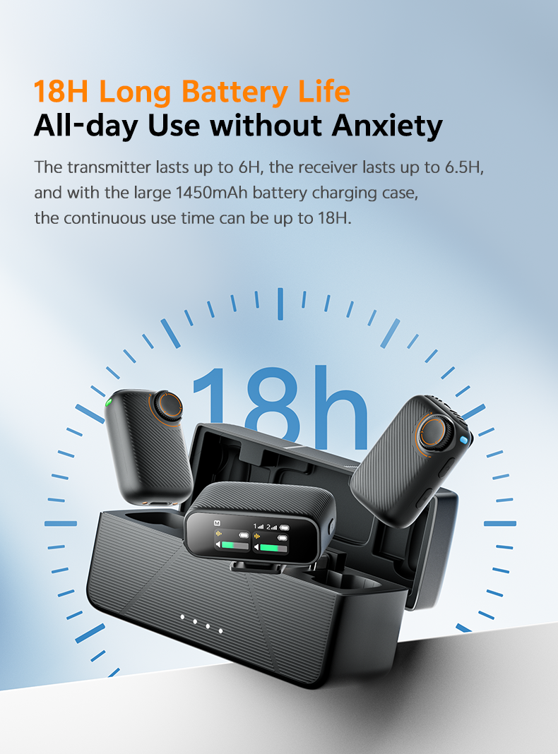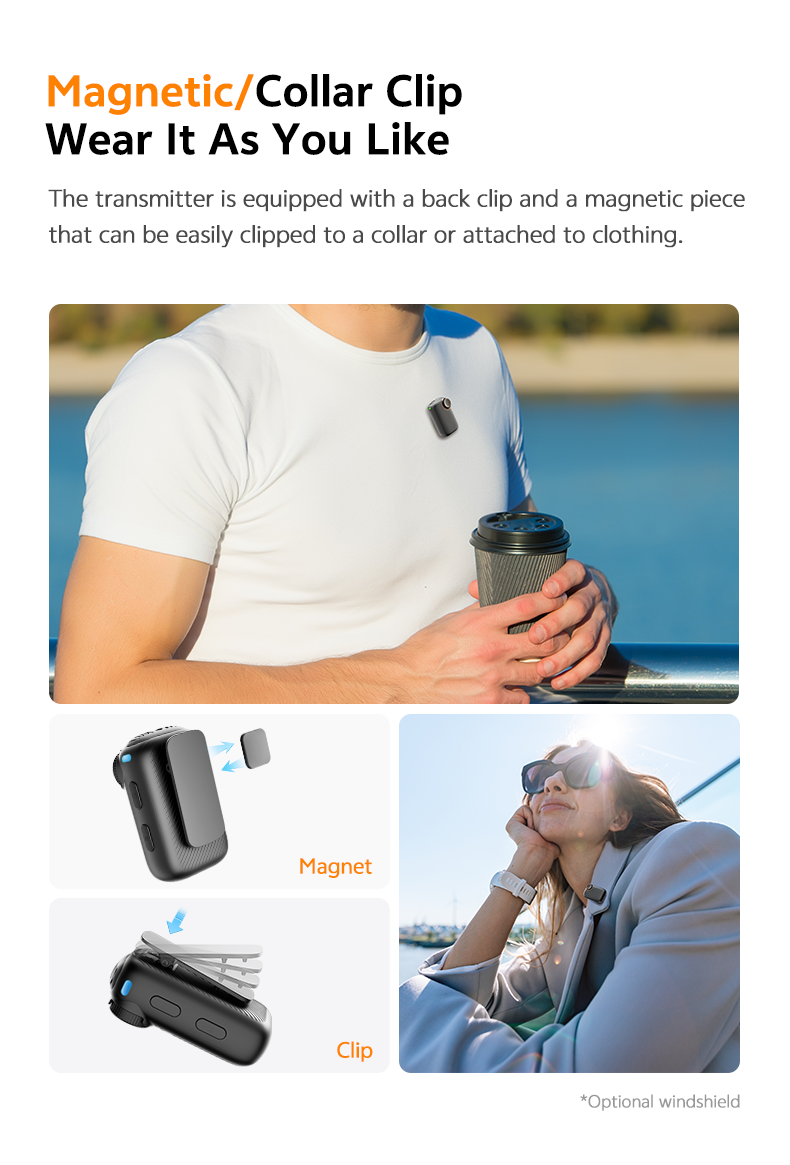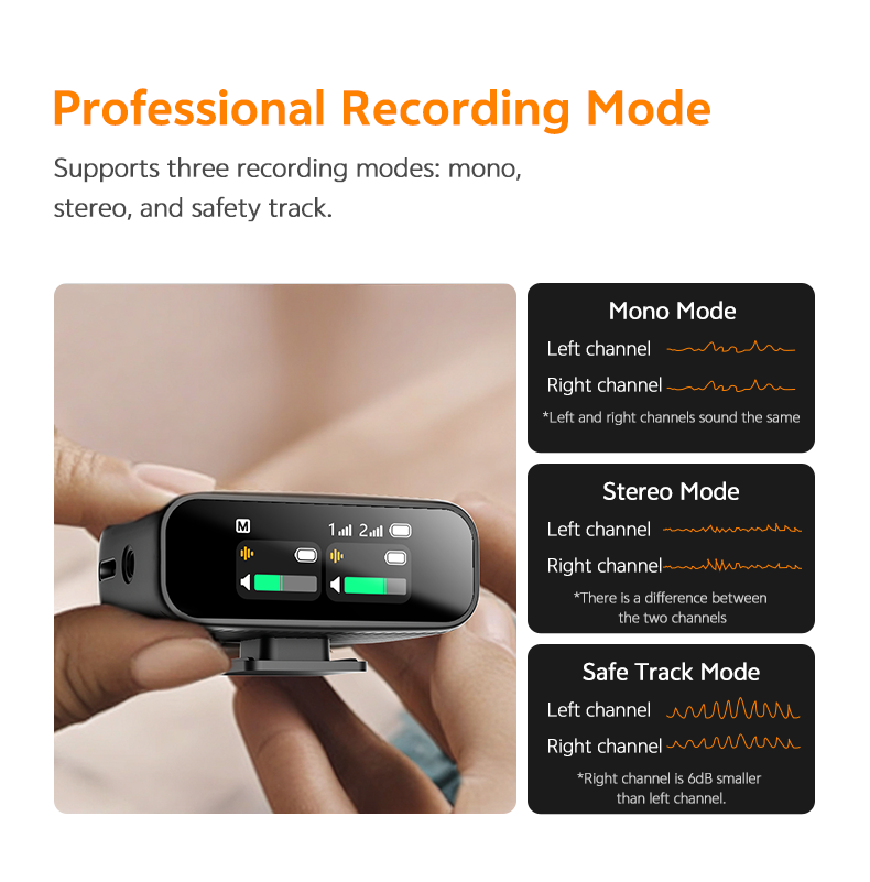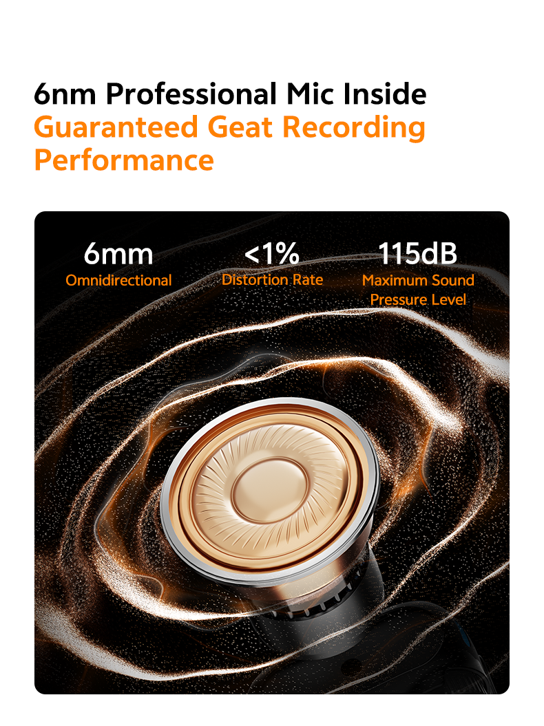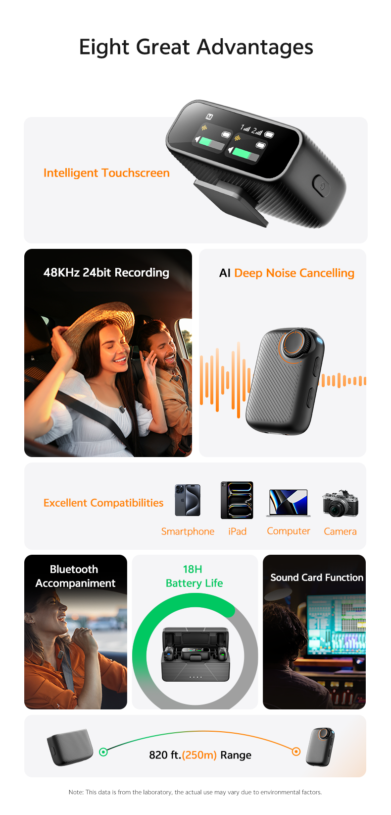 AI MINI II — Compact wireless lavalier microphone for iOS, Android, and cameras. Features ANC noise cancellation, 250m range, voice effects, reverb, and long battery life
